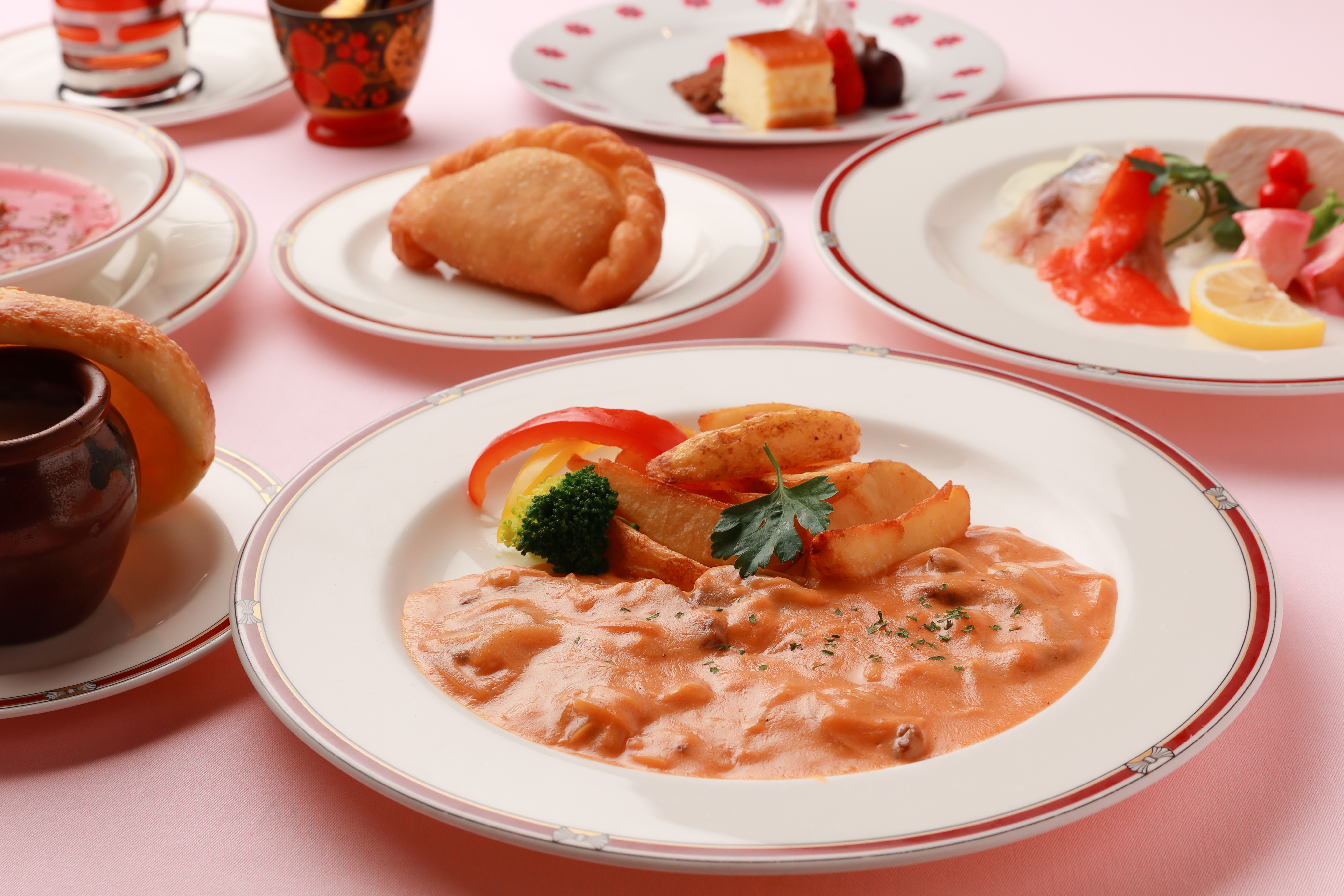 Bランチには、ボルシチ、ゴルブッツィ(ロールキャベツ)、ピロシキ、カプスタサラダ (きゃべつのサラダ)、ロシアンティーが頂けます。